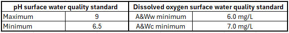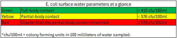 | YELLOW | results are below some applicable surface water quality standards for full body contact (i.e. swimming) but meet partial body contact (i.e. wading or boating) standards. |