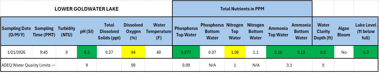 January 15th, 2026: due to low water conditions a the boat dock the planned phosphorus treatment at Upper Goldwater Lake was postponed until water levels are above 6ft below spillway level.